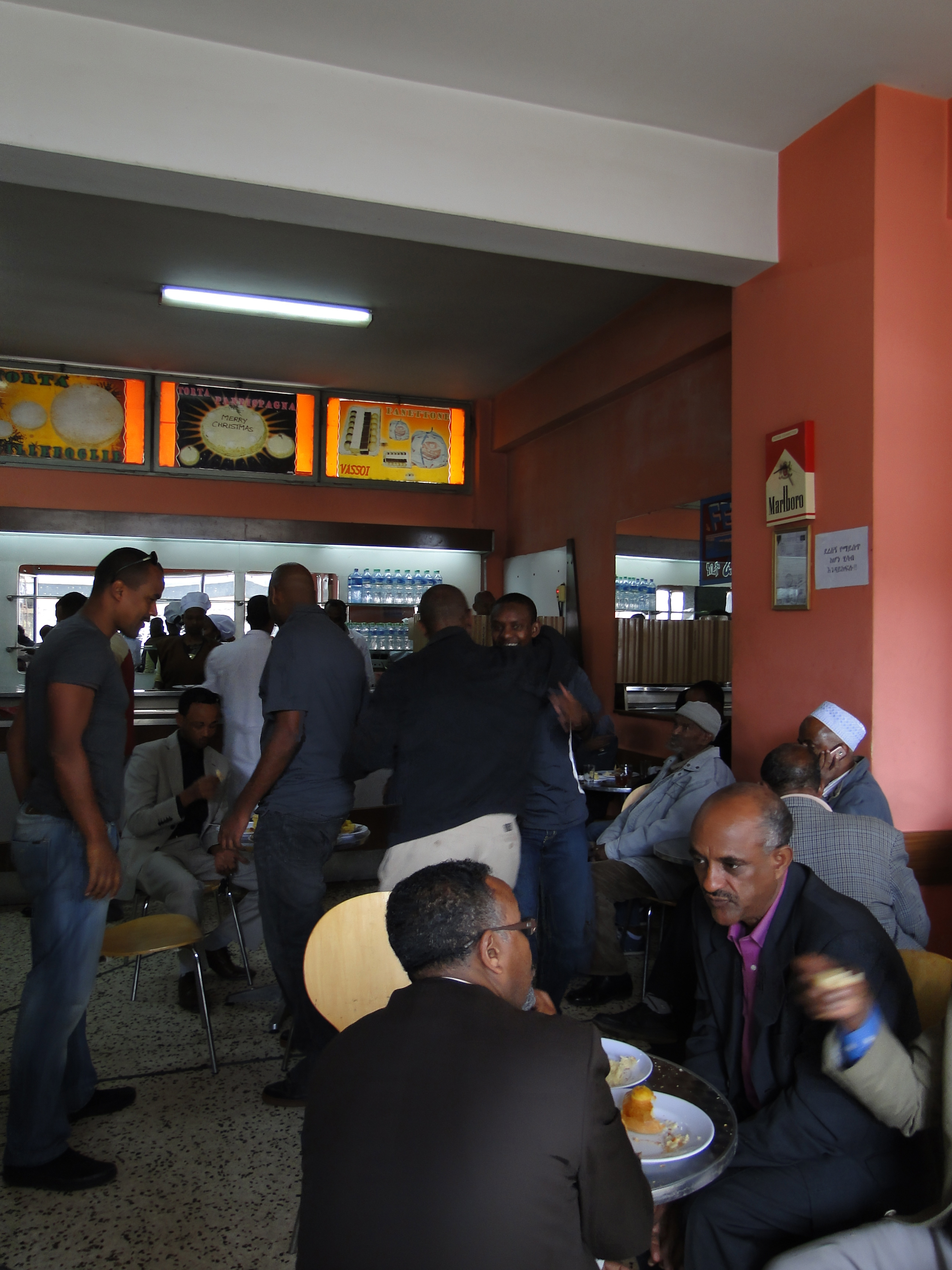 I finally went to Piassa (from the Italian word piazza), one of the oldest area in Addis, and maybe the only one which still has old buildings dating from the beginning of the 20th century. Piassa is also known for its late-night bars and clubs, for its restaurants and daytime shopping (particularly Ethiopian silver jewelry). In Piassa, we find Enrico’s, the most famous pastry shop in the city, where generations of Ethiopians have bought birthday and Christmas cakes. I understand Enrico’s is a bit of an institution here. From 7am it is packed with people having breakfast, usually a macchiato coffee (which is the equivalent of a cappuccino in Italy) and a croissant or brioche.
