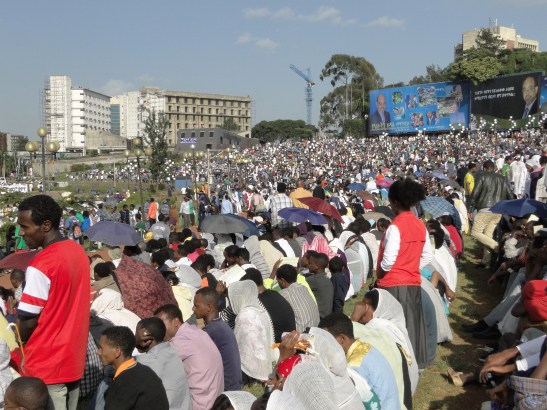 I got there early at about 3pm, when the preparation was still undergoing. Orthodox higher priests in their traditional Ethiopian golden robe and cape were gathering around the bonfire, while other priests in a white robe were chanting and moving to the sound of drums. They were waiting for the main dignitaries such as the Prime Minister, the Patriarch and the Mayor of Addis to arrive. About an hour later, as more people had gathered in the square, the ceremony began with an open air mass. People fervently joined in, praying and chanting along with the priests. The atmosphere was very peaceful and quite spiritual, especially considering the huge crowd. Many policemen were carefully watching to make sure the event stayed peaceful all along. At some point, a couple of policemen caught a young woman with a baby who had been begging, I don’t know if she had tried to steal from someone, but what surprised me was the crowd’s reaction: people started applauding the police for taking her and her baby away. I didn’t fully understand what happened being such an outsider; was the crowd happy that the police intervened to keep the event a peaceful one? After an hour of mass, the ceremony carried on with various speeches from the dignitaries. The only one I could understand was the mayor’s speech because he spoke in English at some point, asking UNESCO to add the Meskal peace on its list of world heritage events. In his view, it symbolises not only peace in Ethiopia but peace for the world.