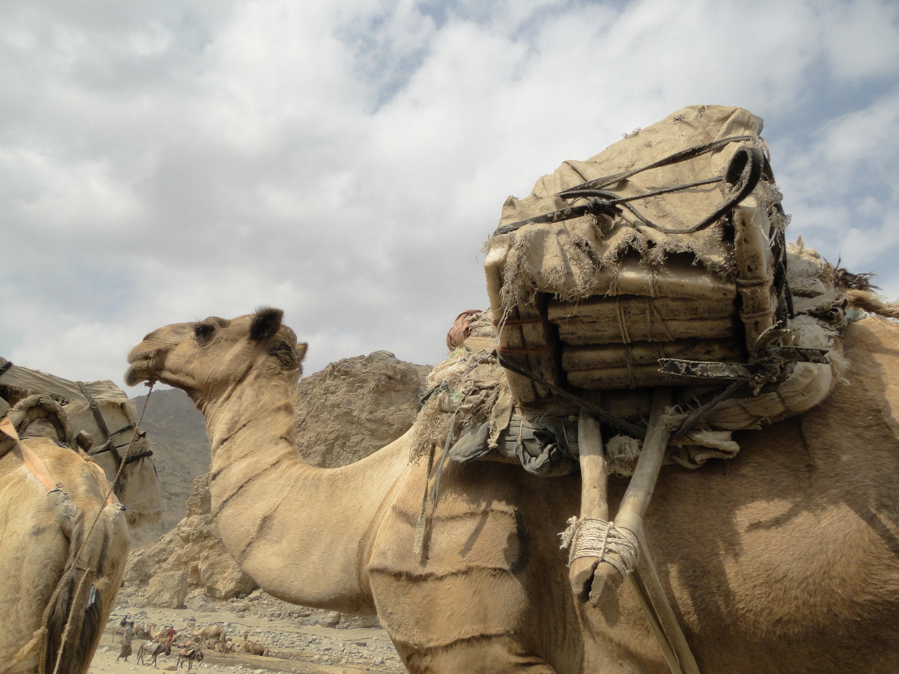 For the Afari people, camel caravans are a harsh daily reality, as we saw that day when we walked through a gorge following the same path as the caravans. As someone pointed out, we did it for fun and after the six hour walk on a rocky terrain in the heat and with very little shade to protect us, we had a car to pick us up and take us to the next camp. The caravans have to take that walk every day for years and years as this is their livelihood. They do not walk 20 kilometres as we did, but much more, going all to the way from Mekele to the salt plains where they still extract salt by hand. They have no respite, they go one way and then back the other, setting camps along the way to spend the night and give a break to their camels. Their way of living has not changed in two thousand years, they survive on very little, eating mainly porridge and goat meat sometimes. Their land, covered with rocks and stones, yields nothing by salt, and that’s what they have to live on. Transporting salt back and forth until they collapse.