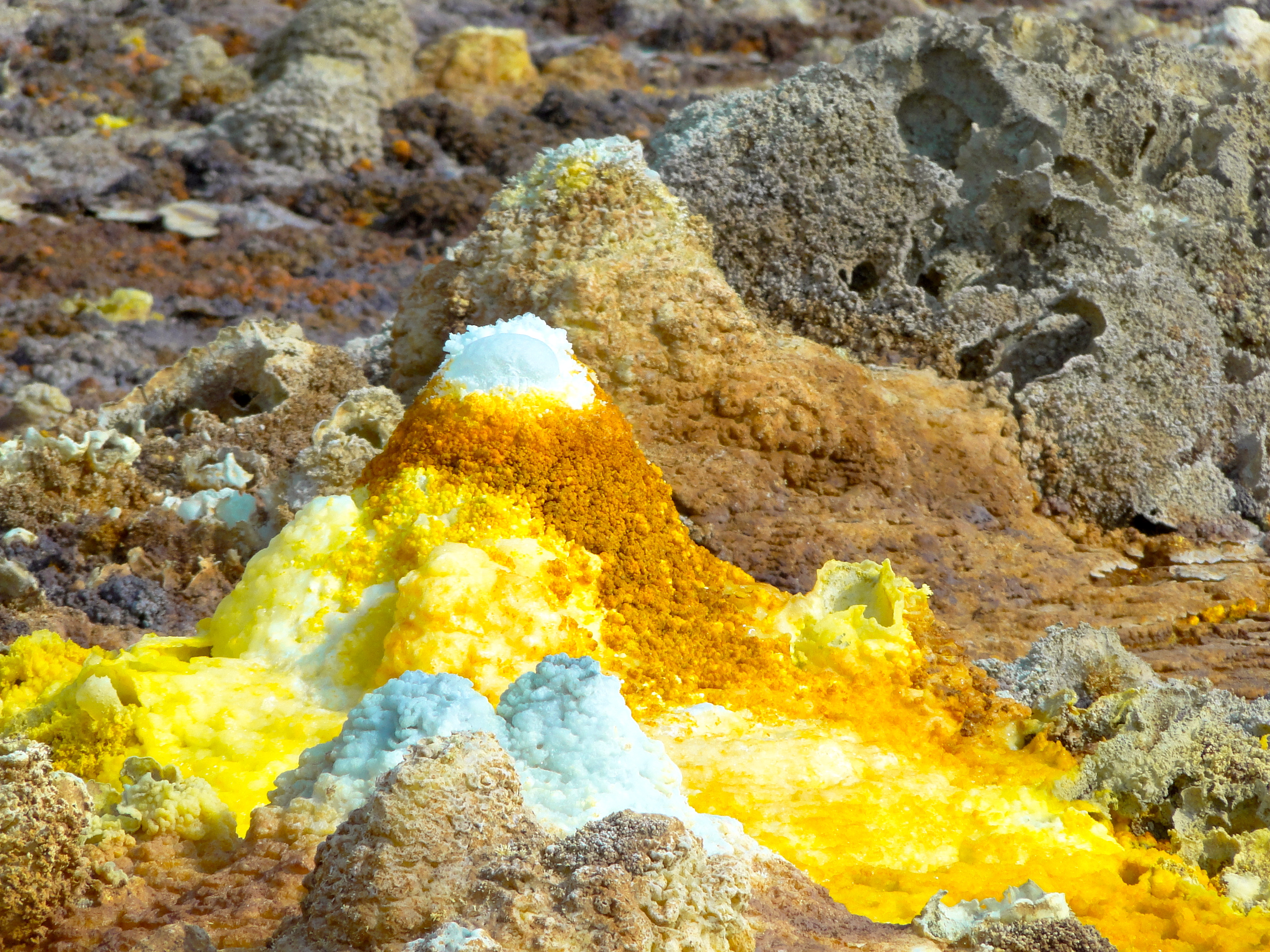 We started climbing up an adjacent hill covered with mushroom-like shapes and once at the top, we got a full view over the amazing and colourful sulphur plains inside the Dallol crater. The area was actually formed by a volcanic explosion during which the basaltic magma merged with existing salt deposits. The last explosion which occured in 1926 and is technically known as a phreatic eruption, formed a 30 metres wide crater where current activity is in the form of hot brine springs. The salts washed out of the underlying layers, are transported to the surface by geothermally heated water and rapidly crystallise as the water evaporates. The characteristic yellow, amber, green and red colours are the results of sulphur and potassium salts coloured by various ions.