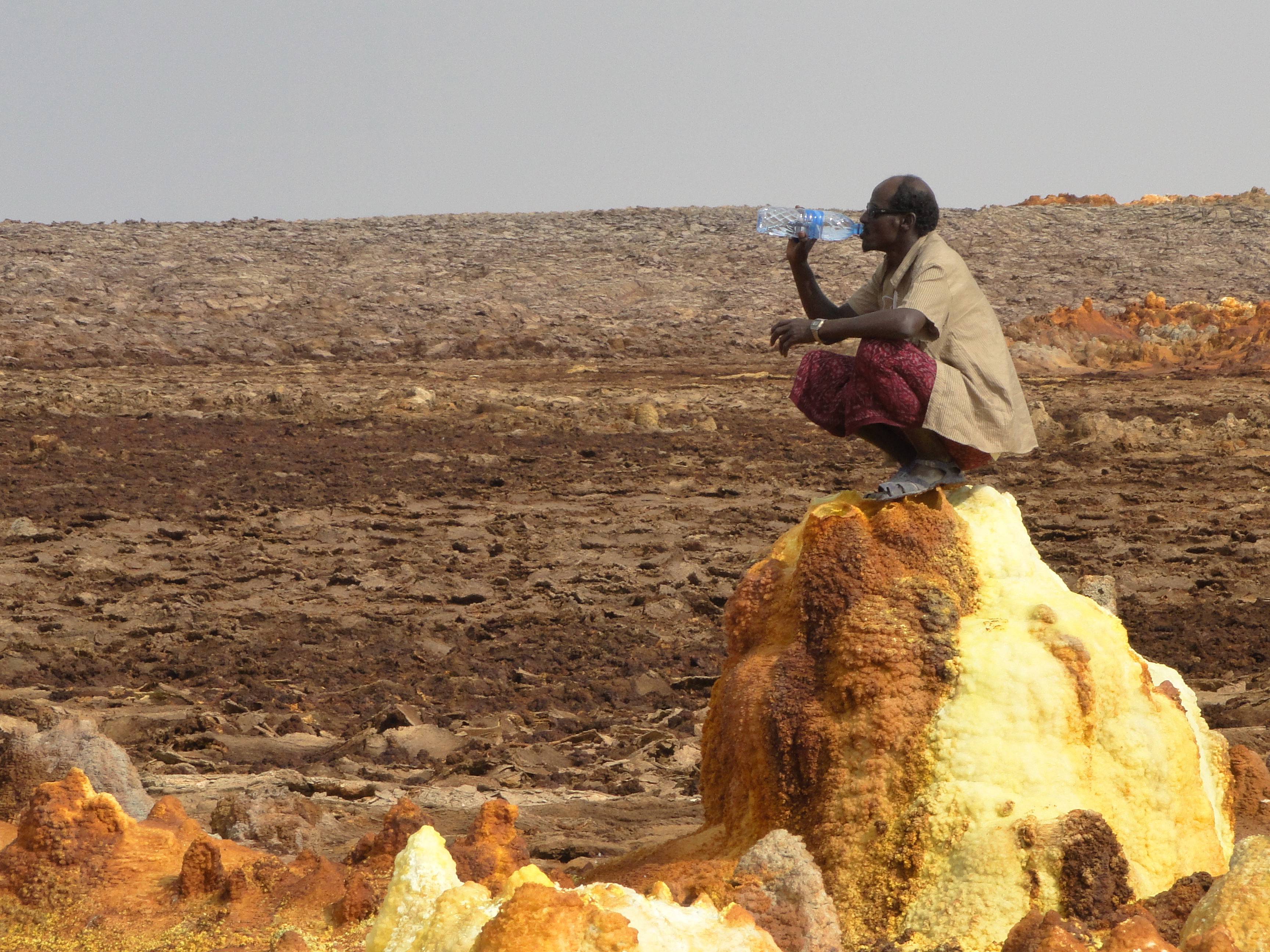 For visitors, Hamadila is the base from which to see the salt extraction sites as well as the famous sulphur plains of Dallol, one of the main attractions in the Danakil depression and a real feast of colours. We went there early on the third day of our trip, and of course were not disappointed. Everything in the Danakil lives up to expectations, because it is so different from anything we know; we really felt we had come to a different planet. Our first vision was a surreal desert castle with organic and in some parts phallic shapes. It was a natural formation made of soil and cristallised salt and created through an erosion process on the edge of the sulphur plains.