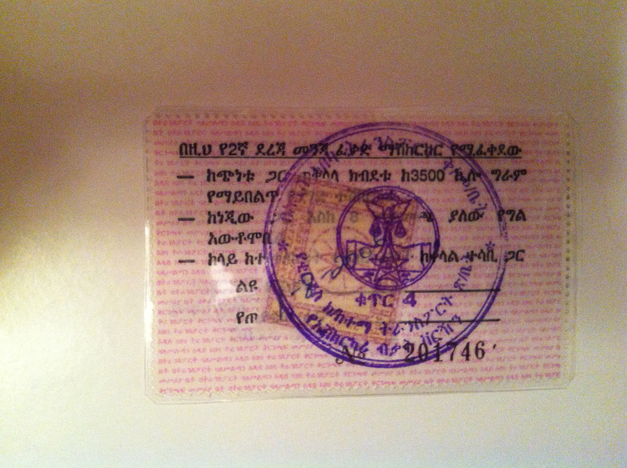 On arrival, I had to buy a form which costs 5 birr (o.2 euros) and which is in Amharic only, so I had to ask the help of my driver to fill it up. It made me realise what it feels like to be illiterate and not being able to even read a form. Once that done, I had to go to another cashier to buy a tax stamp for 6 birr (0.24). Then I went to another office to enter the information on the form into the computer. There was no network so I had to wait (not long, only 20 minutes). Once that was completed, I was sent to the second floor, to office number 205, where I had to wait until they retrieved my file. That office was hidden behing a partition wall, we had to communicate through a tiny window without even seeing the person we were talking to. I managed to have a peak through and all I could see was shelves and shelves of shabby files, fighting for space. After about 30 minutes, my name was called and a lady came out with my file. She took me back downstairs where I initially started and where this time, I had my photo taken (by one person) and the renewed licence was printed and officially stamped (by another person). I was a bit confused as for the picture I had to go inside the office room whereby for getting the licence I was sent back outside in front of the counter’s window, even though it was exactly the same office. That part cost me 100 birr (4 euros). The whole room seemed disorganised with many desks piled up with an impressive quantity of files, however, the staff seemed to find their way through it. Once I had my licence in hand, I had to go to yet another counter to have it laminated. I was charged another 5 birr for that service. All in all, it took me one and a half hour which was amazingly fast, so I will not complain about the Ethiopian bureaucracy on this occasion. I have seen worse, in Italy for instance, where we usually have to go back three times to the same administration to have anything done.
