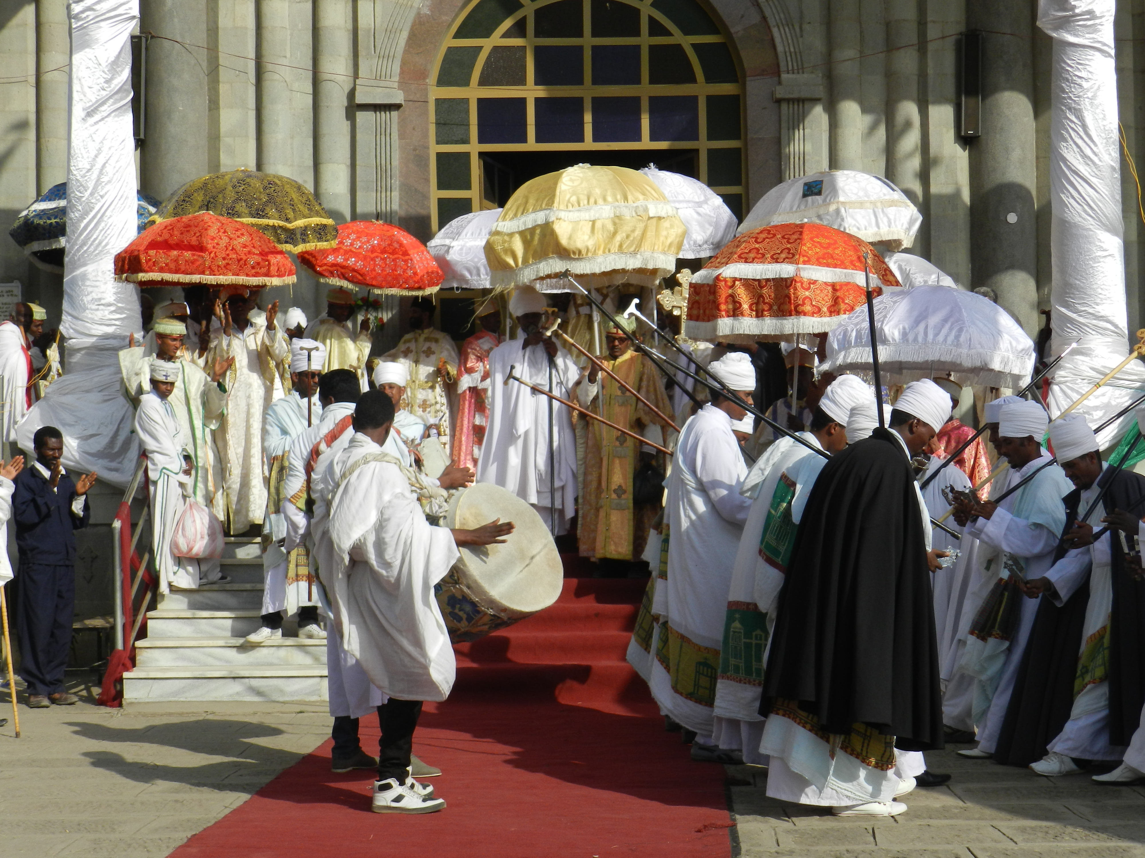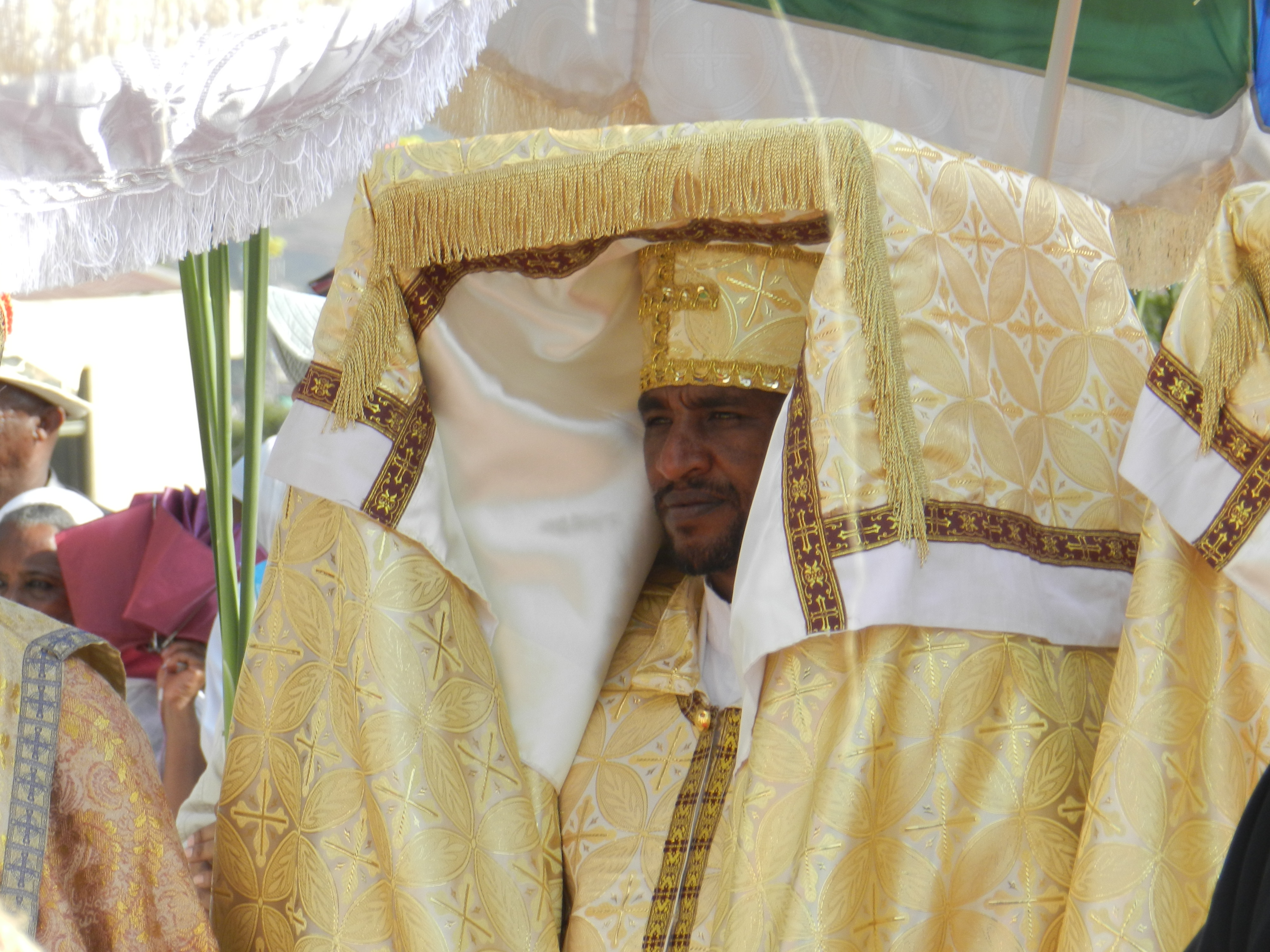 In Addis, each church starts its own procession to eventually converge in a massive flow of people in Jan Meda, the wide open space north of the city where the Patriarch is to address the Nation on Timkat day. As a symbolic gesture of the Baptism ceremony, the Patriarch sprinkles water on the pilgrims attending it. In a unique display, the Priests and abbots, wearing their most elaborate and colourful outfits and umbrellas on leaving their respective churches, are greeted along the way by pilgrims chanting, kneeling down and respectfully bowing to show their faith.